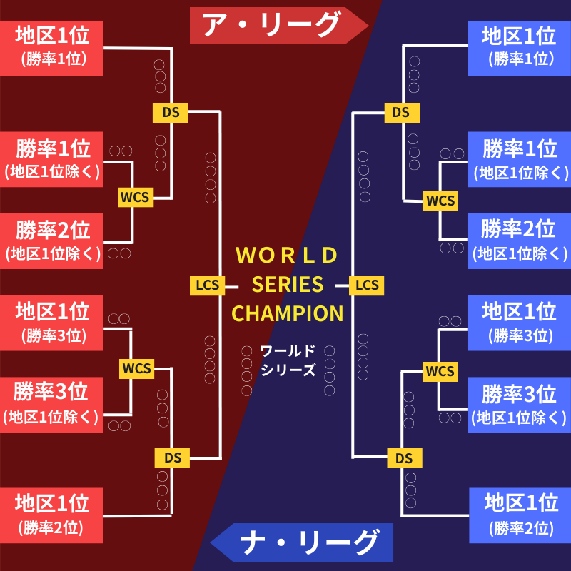 ワイルドカードシリーズ(WCS) | 3戦2勝制 | 各リーグのワイルドカード1位と2位、地区優勝チーム(最下位の勝率)とワイルドカード3位が対戦 全試合上位シードチームの本拠地で開催 |